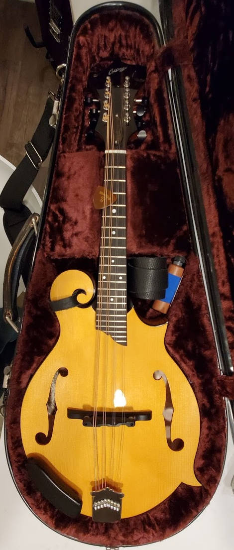 My old mandolin I also picked up at the Olde Town Pickin' Parlor.  Kit called it a "sorta-Gibson" and Liz said it was for people who "wanted the look without the price".  It's a handmade homage to the 'teens Gibson Master Model that I'm fairly certain was made out of a chair someboy didn't like.  It's heavy and not particularly well made, but it's got mojo and I played the heck out of it.  I had Micah Lundy at the Olde Town Pickin' Parlor repair shop install a K+K Mandolin Twin pickup at their shop and I played a ton of open mics with it.  The old mandolin is my preferred mandolin for gigging.  It's heavy, beefy, has a pickup installed, and I wouldn't cry if it got some beer spilled on it.  It's already had a fair share of coffee.